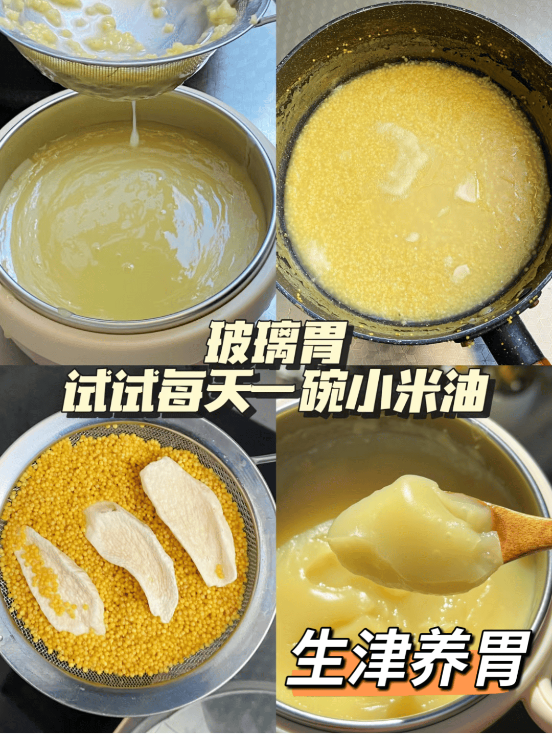做法:半把小米洗净,加 500ml 水(水米比 10:1),大火煮开后转小火煮20- 25分钟;关火后只取上层米油,放温后空腹喝。