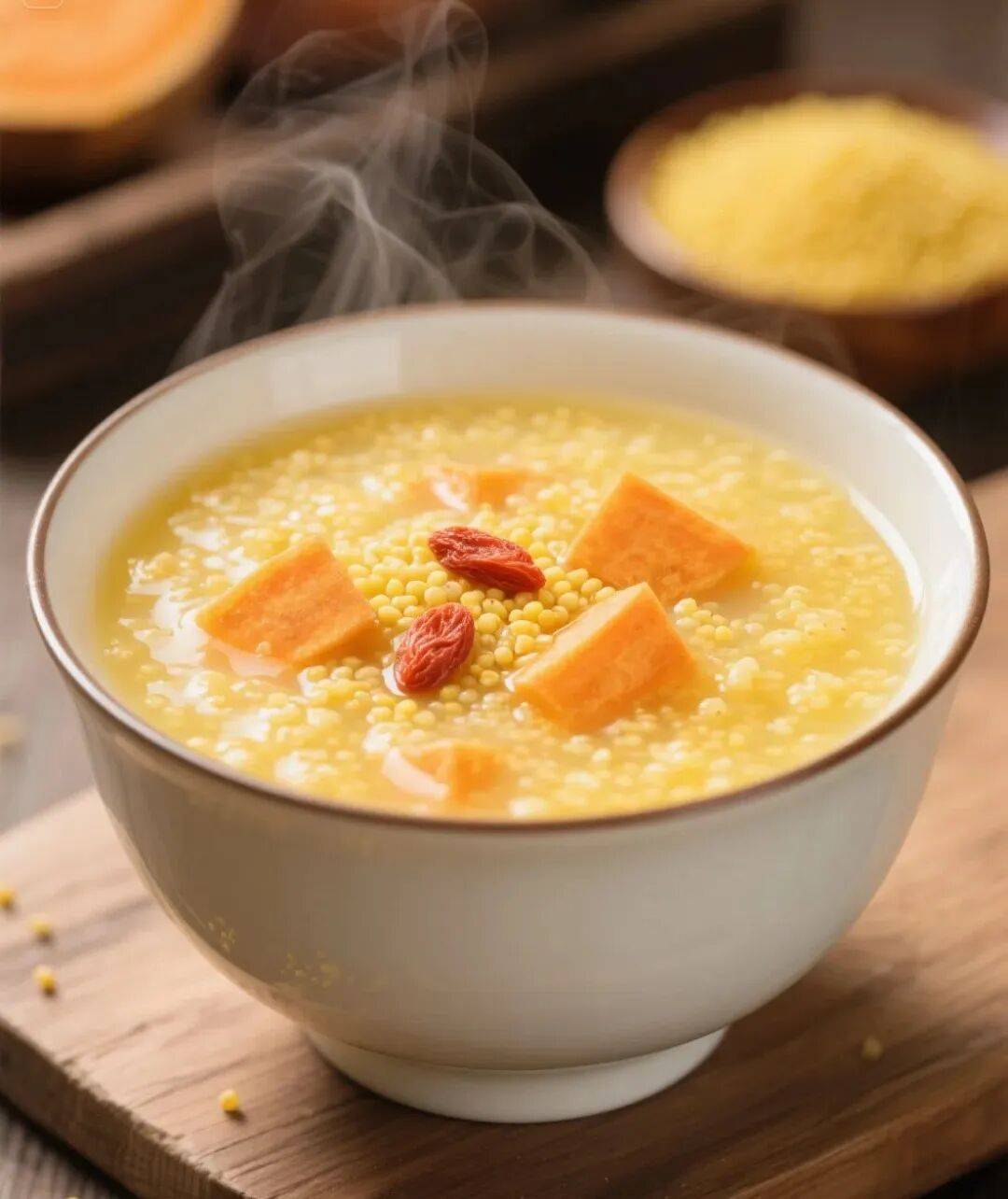 做法:小米 60g、红薯 150g(切块)、枸杞 10g,小米煮 15 分钟后加红薯块,煮至红薯软烂;关火前 5 分钟加枸杞,搅一搅就能喝。