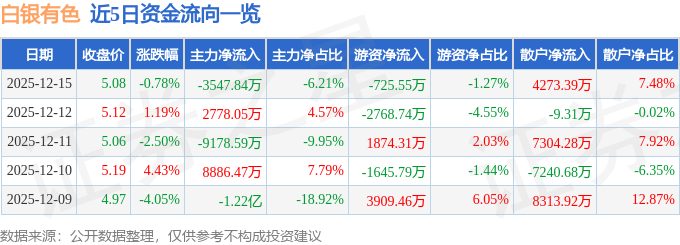证券之星消息,截至2025年12月15日收盘,白银有色(601212)报收于5.08元,下跌0.78%,换手率1.53%,成交量113.26万手,成交额5.72亿元。