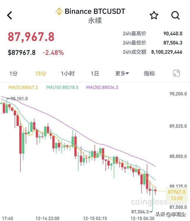 北京时间12月15日早间,加密货币市场突发“血洗式”暴跌,比特币率先跌破8.8万美元关键关口,以太坊、狗狗币等币种集体重挫。