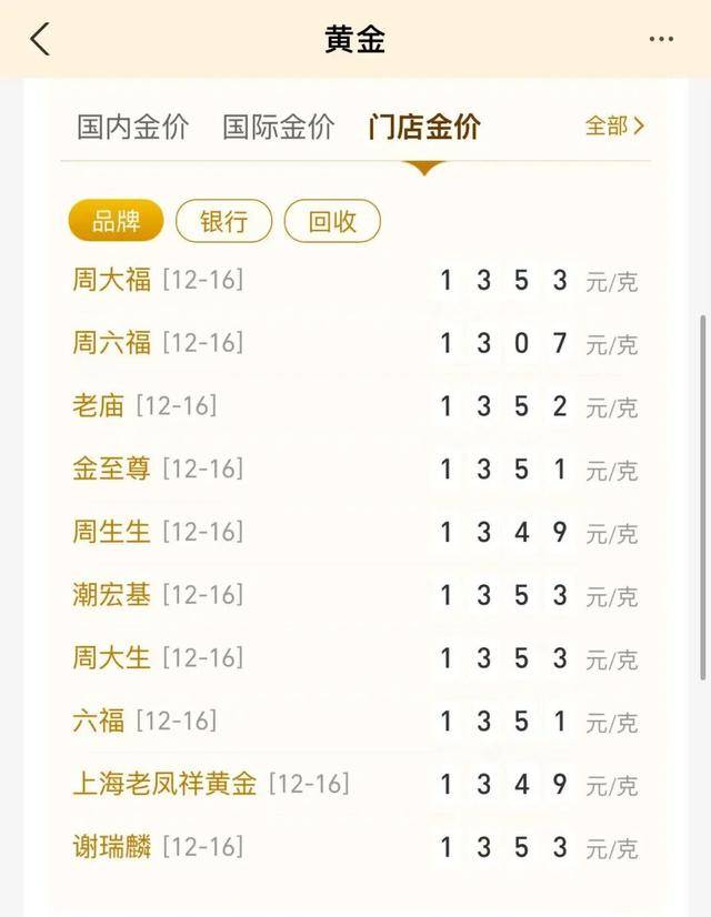 受此影响,国内品牌金饰价格多日连涨态势也随之终结。中新经纬16日查询到,周生生足金饰品报1349元/克,较昨日跌4元/克,终结自12月10日起的五连涨;周大福、老庙黄金、老凤祥等品牌,金饰克价较昨日保持不变。