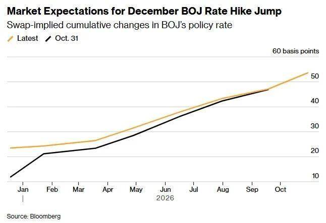 彭博汇总数据显示,隔夜指数互换(OIS)目前显示,日本央行本周上调政策利率的概率超过90%,约为10月底市场定价概率的两倍。这些合约也已完全计入到2026年10月前还将再加息一次。