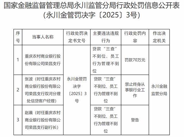 针对上述违法违规行为,国家金融监督管理总局永川监管分局对其罚款70万元,对时任重庆农村商业银行股份有限公司荣昌支行双河分理处信贷客户经理张波禁止终身从事银行业工作,对时任重庆农村商业银行股份有限公司荣昌支行副行长赵晨警告。