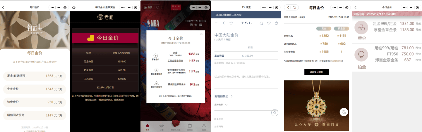 12月17日,多家黄金珠宝品牌公布的单克境内足金饰品价格普遍与前一日持平或上调1-3元,延续1350元/克左右高位。
