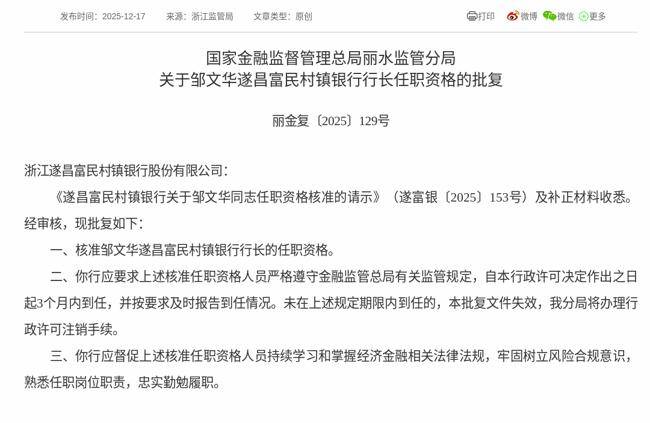 2025年12月17日,根据国家金融监督管理总局消息,《遂昌富民村镇银行关于邹文华同志任职资格核准的请示》获得通过,批复邹文华浙江遂昌富民村镇银行股份有限公司行长的任职资格。
