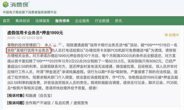 目前在黑猫投诉上和和融通支付(会员宝)相关的投诉超过2000条,消费保支付平台上相关投诉近百条。记者梳理发现,为向消费者推销会员宝POS机,办理人员还采取了多种手段,包括冒称是某银行客服人员,以办大额信用卡为由诱导消费者注册申请机器,“要领信用卡要先用他们的刷卡机,激活才有信用卡”。推销时称没有任何费用,办理后才告知押金,刷卡后直接扣取流量费等。
