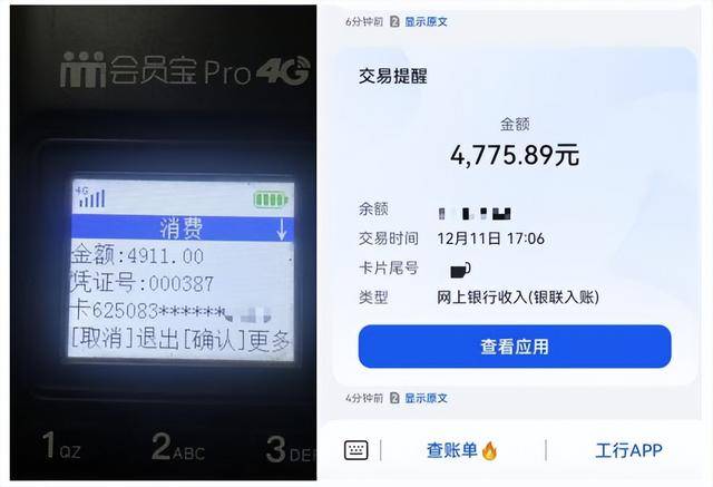 另一位消费者小鹏(化名)是会员宝的老用户,他从2023年就开始使用他家POS机,之前刷卡费率一直是0.6%,今年12月11日,小鹏的会员宝P0S机上刷卡了一笔4911元的消费,但是到账仅4775.89元,被扣了135元,“按正常费率应该扣29.46元,多扣了100多。我打会员宝的客服电话要求退款,但对方态度强应拒绝返还。”