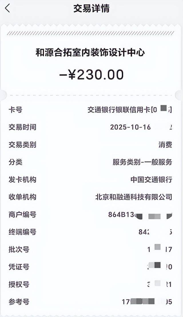 根据小付提供的交易详情截图,其在浙江宁波某商家的会员宝Pro POS机刷卡,收款的商户显示是“和源合拓室内装饰设计中心”。
