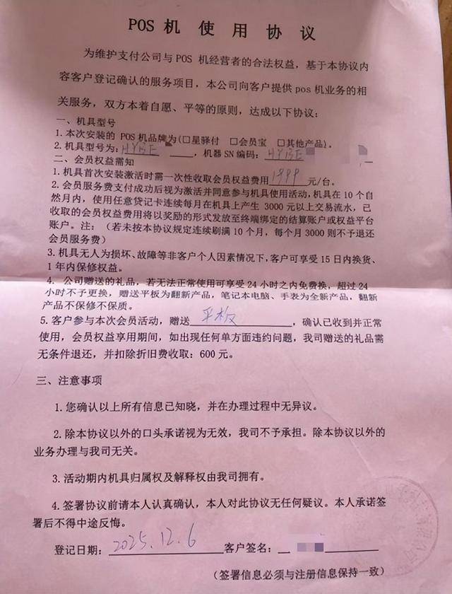 小方(化名)向记者表示,12月初,有业务员以“办理会员宝POS机免费赠送平板”为噱头诱导其办理相关业务。当时办理人员承诺免费办理,激活时才告知要收取1999元押金,后续10个月里每个月刷满3000元,即可全额原路退还。办理人员走后,小方越想越不对劲,第二天联系其申请退还机器和平板,退回押金。
