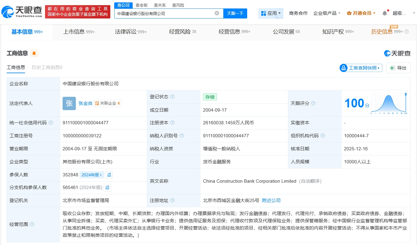 松果财经讯,天眼查App显示,近日,建设银行(601939)发生工商变更,注册资本由约2500亿人民币增至约2616亿人民币。