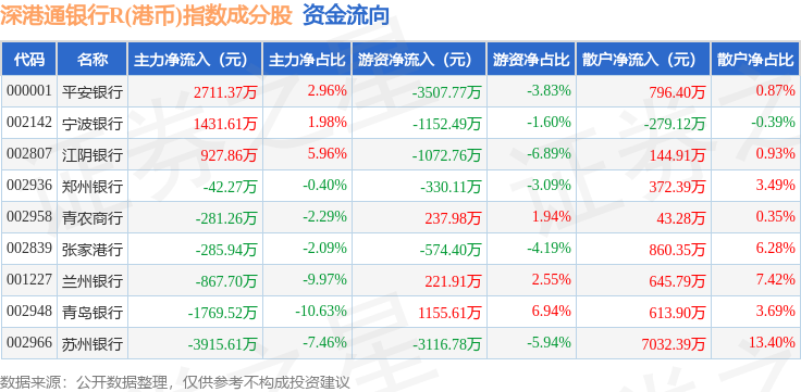 资金流向方面,深港通银行R(港币)(483082)指数成份股当日主力资金净流出合计2091.46万元,游资资金净流出合计8138.81万元,散户资金净流入合计1.02亿元。成份股资金流向详情见下表: