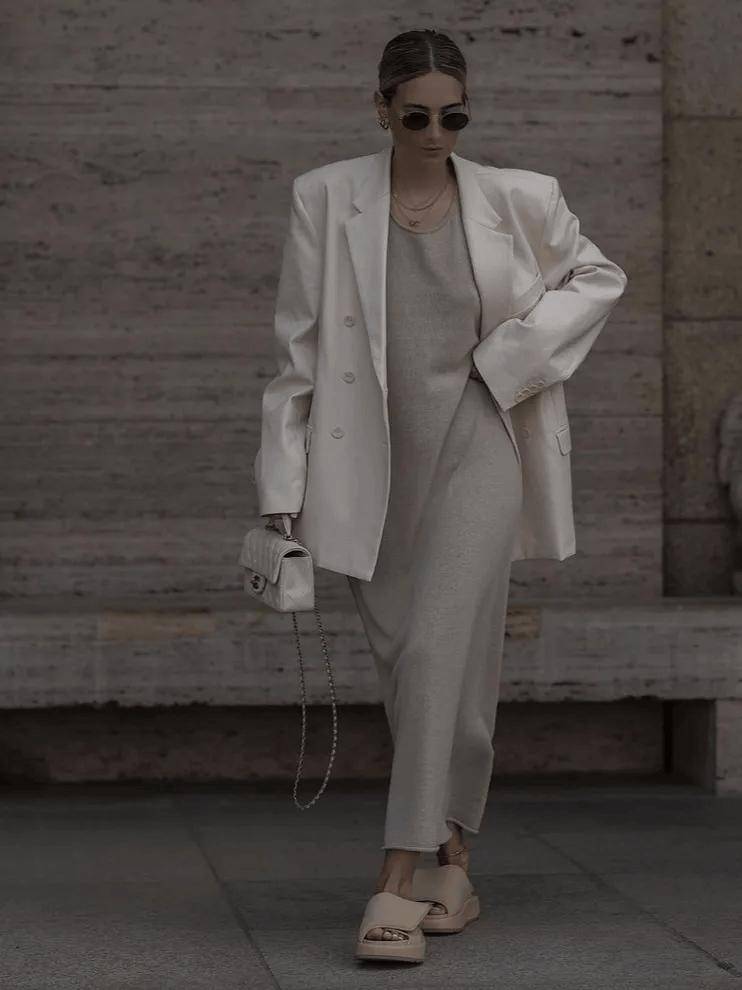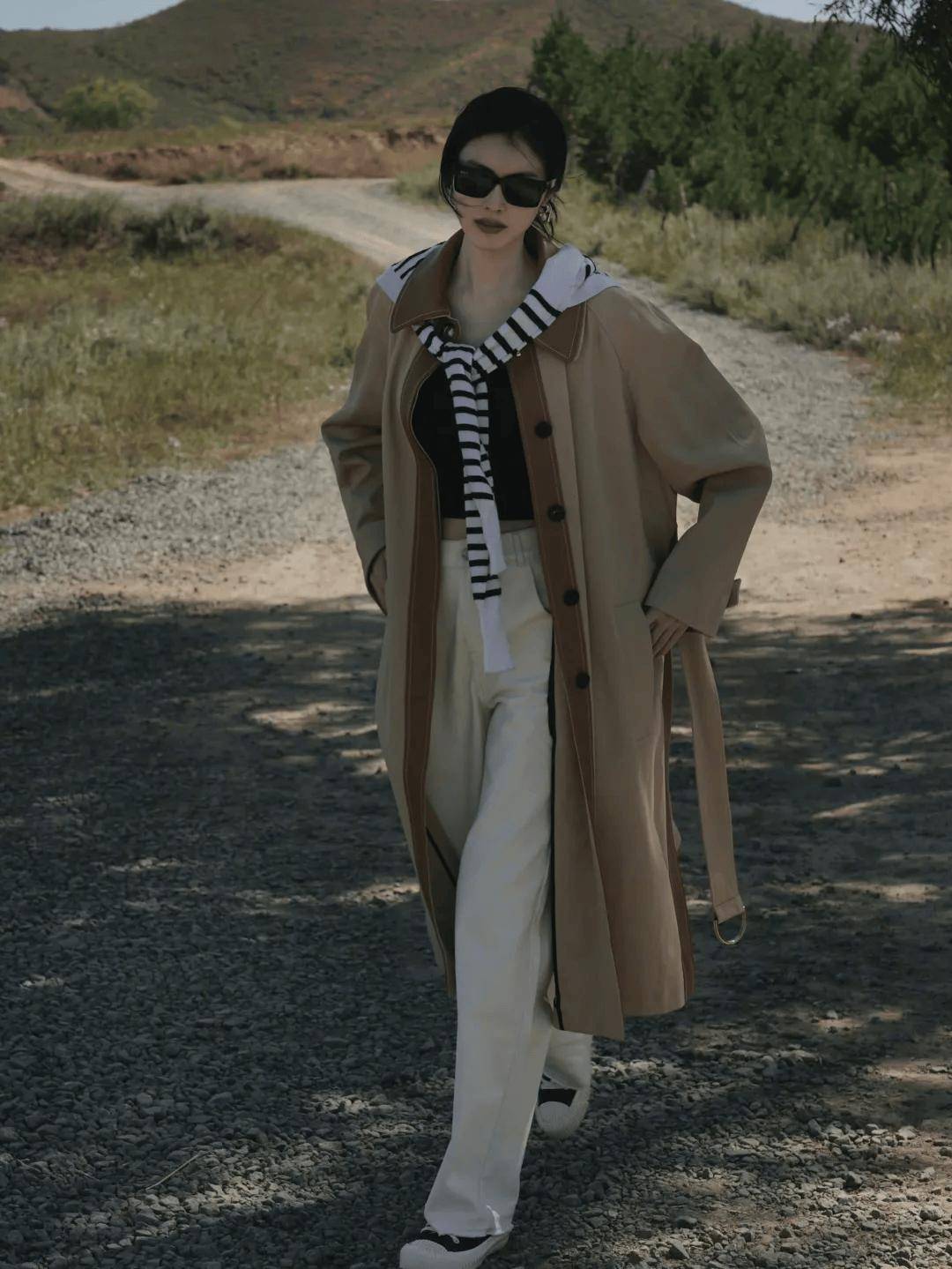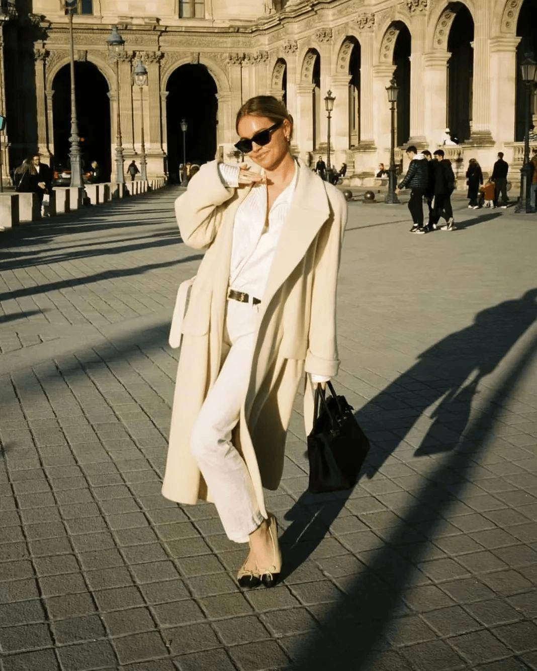 优选垂坠感大衣(衣长过膝不过膝肚)或一体式连衣裙,通过单件剪裁实现视觉延伸。如巴黎博主Leoniehanne示范的明黄色直筒大衣,通过纵向线条延伸实现视觉扩容。进阶搭配可尝试高腰阔腿裤+短外套组合,利用垂坠面料与硬挺廓形的对比,塑造沙漏型身形。