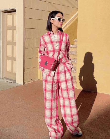 采用"珍珠白-米杏色-奶油黄"的渐变体系,如博主vivid的粉色格纹穿搭,通过同色系深浅过渡形成视觉流线。建议搭配金属色配饰打破沉闷,维持整体和谐度的同时增添精致感。