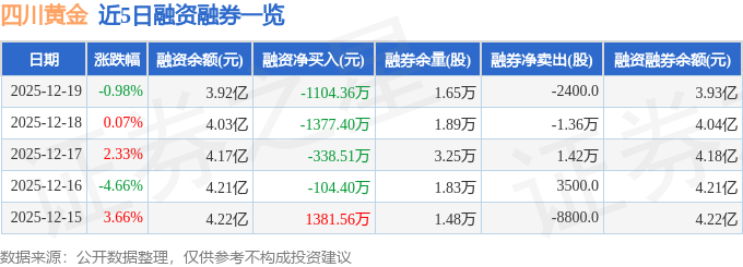 四川黄金融资融券信息显示,融资方面,当日融资买入3530.54万元,融资偿还4634.91万元,融资净偿还1104.36万元。融券方面,融券卖出1200.0股,融券偿还3600.0股,融券余量1.65万股,融券余额46.6万元。融资融券余额3.93亿元。