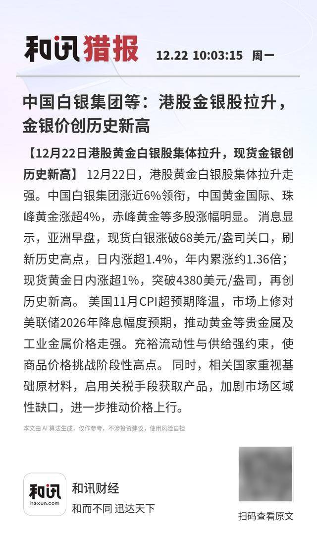【12月22日港股黄金白银股集体拉升,现货金银创历史新高】12月22日,港股黄金白银股集体拉升走强。中国白银集团涨近6%领衔,中国黄金国际、珠峰黄金涨超4%,赤峰黄金等多股涨幅明显。 消息显示,亚洲早盘,现货白银涨破68美元/盎司关口,刷新历史高点,日内涨超1.4%,年内累涨约1.36倍;现货黄金日内涨超1%,突破4380美元/盎司,再创历史新高。 美国11月CPI超预期降温,市场上修对美联储2026年降息幅度预期,推动黄金等贵金属及工业金属价格走强。充裕流动性与供给强约束,使商品价格挑战阶段性高点。 同时,相关国家重视基础原材料,启用关税手段获取产品,加剧市场区域性缺口,进一步推动价格上行。