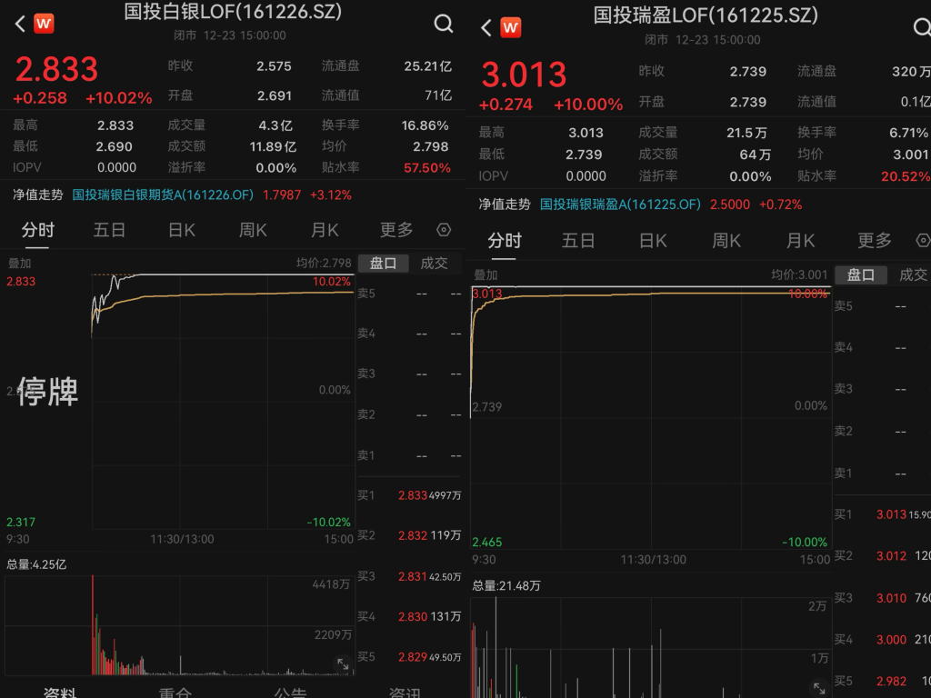 12月23日上午10时30分,因近期持续高溢价被临时停牌一小时的国投白银LOF(161226.SZ)复牌。经历短暂震荡后,价格再度直线拉升,尾盘重封涨停板。