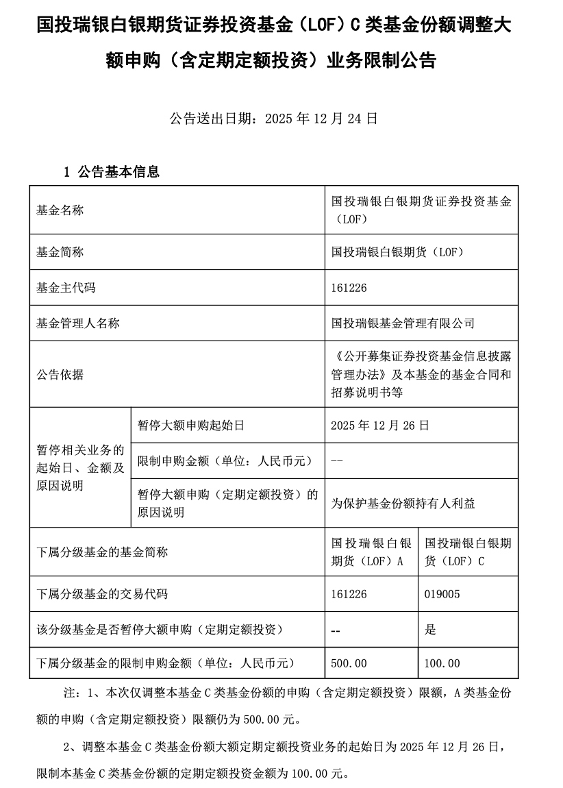 此外,为从机制上平抑溢价,基金申购限额在一周内被连续调整。自12月22日起,国投白银LOF的A类份额申购上限从100元提高至500元,C类份额从1000元降至500元。而根据12月23日晚间的最新公告,自12月26日起,国投白银LOF的C类份额上限将进一步收紧至100元,A类份额维持500元不变。