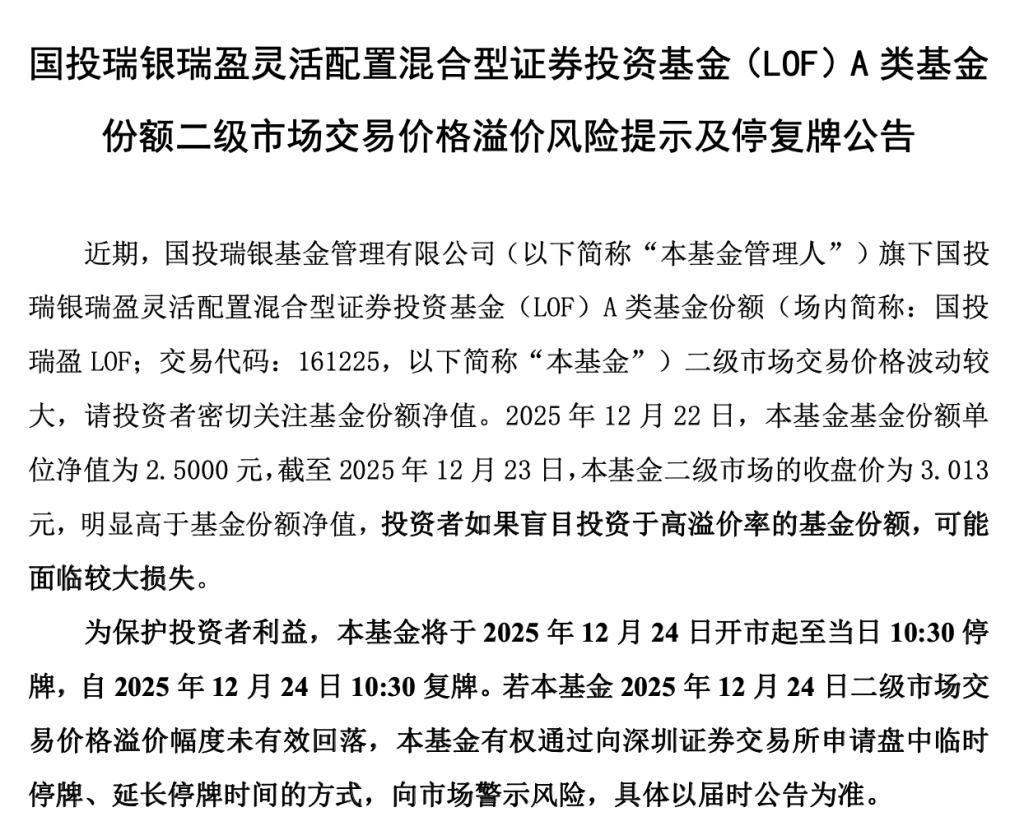 为保护投资者利益,国投瑞盈LOF将于12月24日开市起至当日10时30分停牌,自2025年12月24日10时30分复牌。若该基金2025年12月24日二级市场交易价格溢价幅度未有效回落,将通过向深圳证券交易所申请盘中临时停牌、延长停牌时间的方式,向市场警示风险。