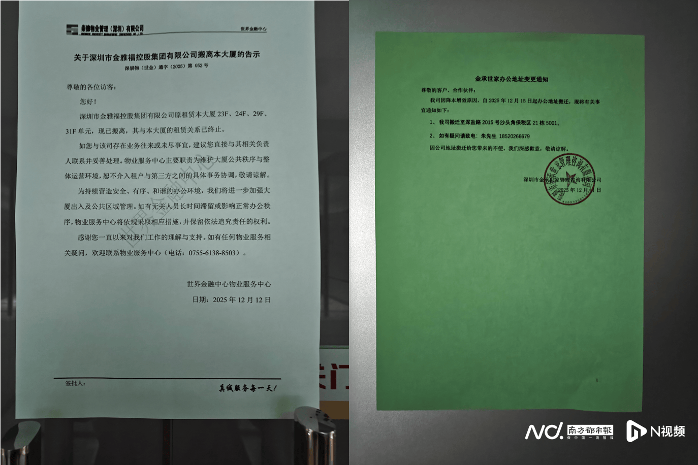 大厦物业服务中心张贴的两份告示证实了金雅福总部搬离的细节。一份告示显示,金雅福原租赁该大厦23、24、29和31层,目前租赁关系已终止,公司已完成搬离;另一份则来自金雅福间接持股71%的深圳市金承世家管理咨询有限公司,该公司以"降本增效"为由,自2025年12月15日起从该地址搬迁。