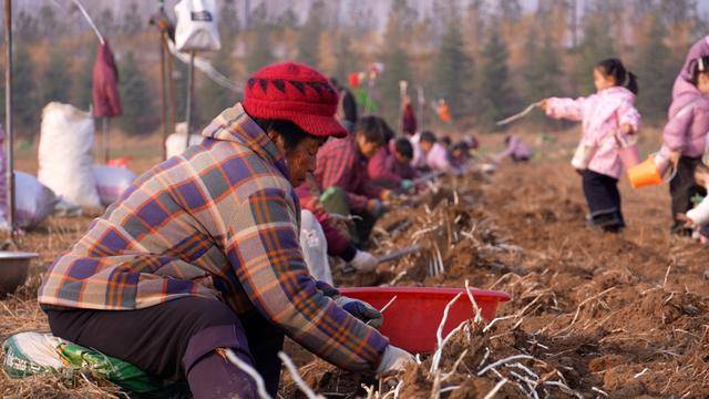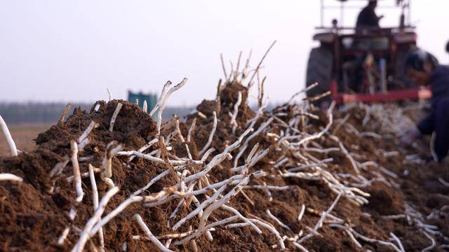 12月23日,洛阳市偃师区岳滩镇岳滩村的田里,拖拉机穿梭,将松软的沙土地翻开,一根根雪白细长的银条露出地面。农户们紧随其后,捡拾整理,笑意盈盈。