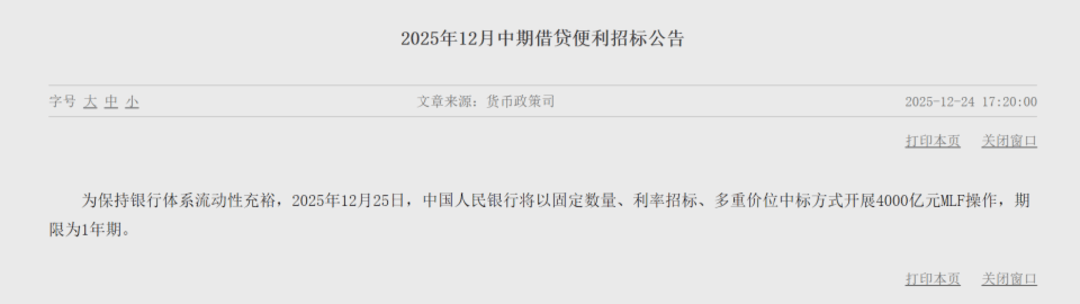 央广网北京12月24日消息(记者 冯方)12月24日,央行发布公告称,为保持银行体系流动性充裕,将于12月25日以固定数量、利率招标、多重价位中标方式开展4000亿元中期借贷便利(MLF)操作,期限为1年期。