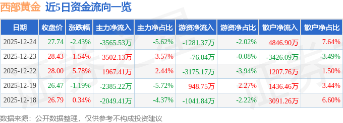 证券之星消息,截至2025年12月24日收盘,西部黄金(601069)报收于27.74元,下跌2.43%,换手率2.55%,成交量22.62万手,成交额6.34亿元。