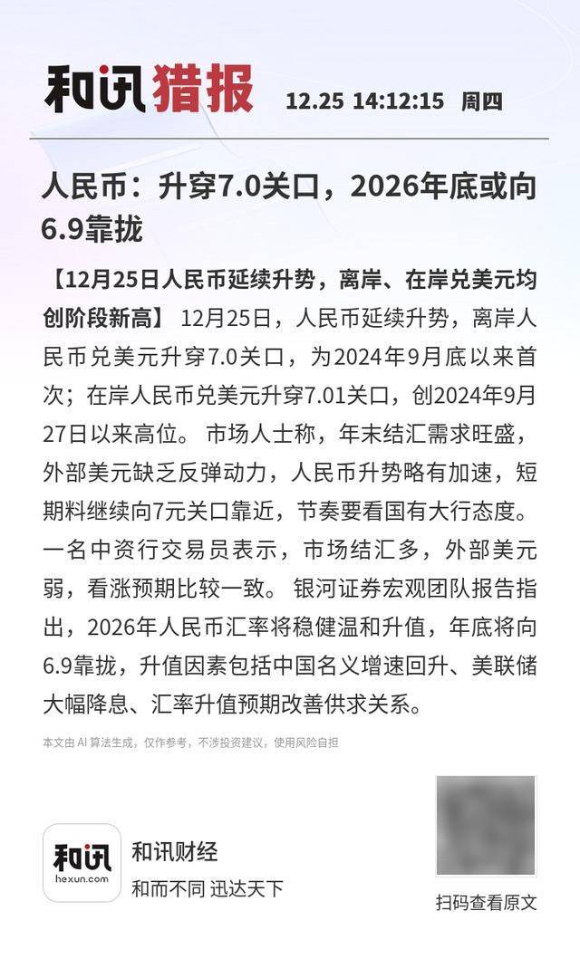 【12月25日人民币延续升势,离岸、在岸兑美元均创阶段新高】12月25日,人民币延续升势,离岸人民币兑美元升穿7.0关口,为2024年9月底以来首次;在岸人民币兑美元升穿7.01关口,创2024年9月27日以来高位。市场人士称,年末结汇需求旺盛,外部美元缺乏反弹动力,人民币升势略有加速,短期料继续向7元关口靠近,节奏要看国有大行态度。一名中资行交易员表示,市场结汇多,外部美元弱,看涨预期比较一致。银河证券宏观团队报告指出,2026年人民币汇率将稳健温和升值,年底将向6.9靠拢,升值因素包括中国名义增速回升、美联储大幅降息、汇率升值预期改善供求关系。