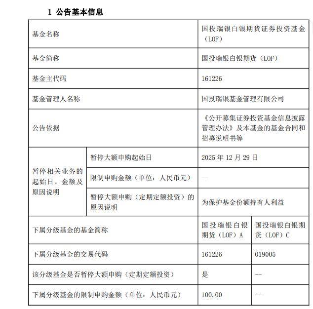 12月25日,国投白银LOF(161226)公告,限制本基金A类基金份额定期定额投资金额为100.00元,调整本基金A类基金份额大额定期定额投资业务的起始日为2025年12月29日。本基金取消或调整上述业务限制的具体时间将另行公告。
