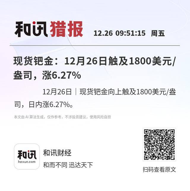 12月26日|现货钯金向上触及1800美元/盎司,日内涨6.27%。
