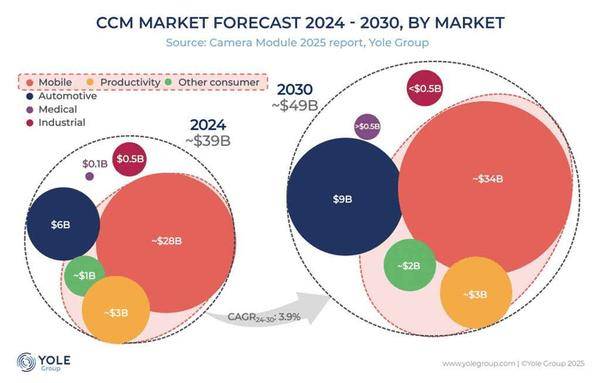 【CNMO科技消息】根据市场研究机构Yole Group的最新分析,全球小型相机模块(CCM)市场已重新进入增长轨道。这主要得益于智能手机需求的恢复,以及汽车、机器人等新市场需求的扩大。CNMO获悉,CCM市场规模预计将从2024年的390亿美元,增长至2030年的490亿美元,年均增长率达3.9%。在数量方面,预计将从2024年的70亿个增至2030年的86亿个以上。