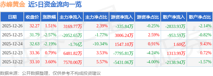 股票行情快报:赤峰黄金(600... 证券之星消息,截至2025年12月26日收盘,赤峰黄金(600988)报收于32.27元,上涨1.5...