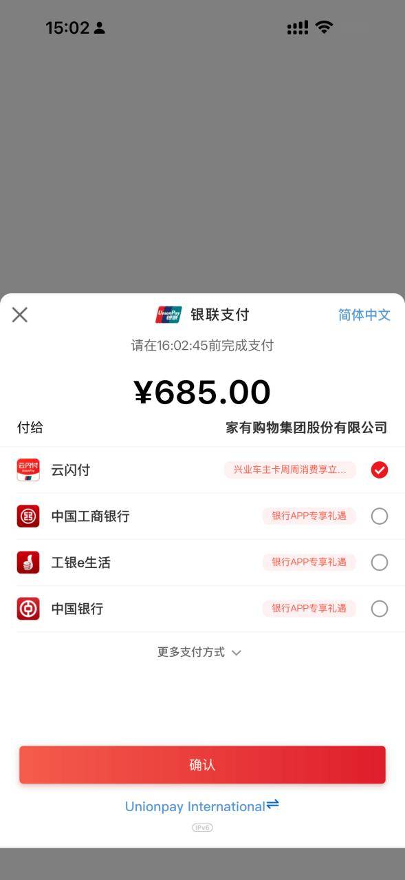 下单后,在支付页面务必选择“云闪付”支付。