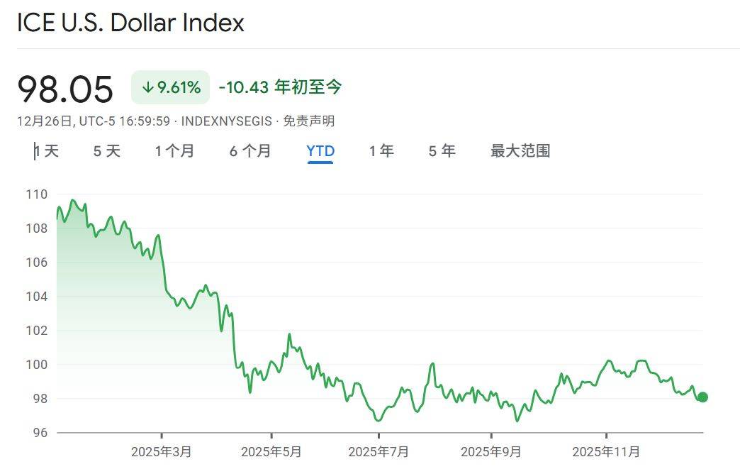 相反,美元指数年内跌幅约10%,恐创下2003年以来最差年度表现。