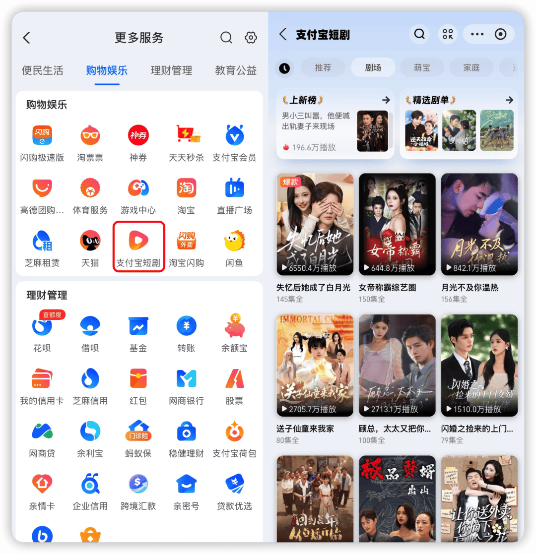 比如在支付宝主页「购物娱乐」板块中,新增的「支付宝短剧」功能。