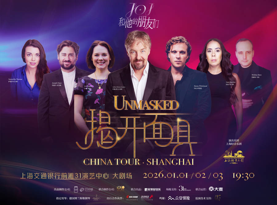 现在,上海观众可以在2026年新年的第一天,现场欣赏到JOJ和他的多位挚友们的表演,近距离感受伦敦西区顶级艺术水准的视听盛宴。《Unmasked 揭开面具——JOJ和他的朋友们》音乐会中国巡演日前在洛克外滩众安大楼露台举办发布会。约翰·欧文-琼斯与本次音乐会音乐总监约翰·奎克共同亮相外滩,为即将于2026年1月1日— 3日在交通银行前滩31演艺中心·大剧场举行的巡演全国首演揭晓闪亮时刻。