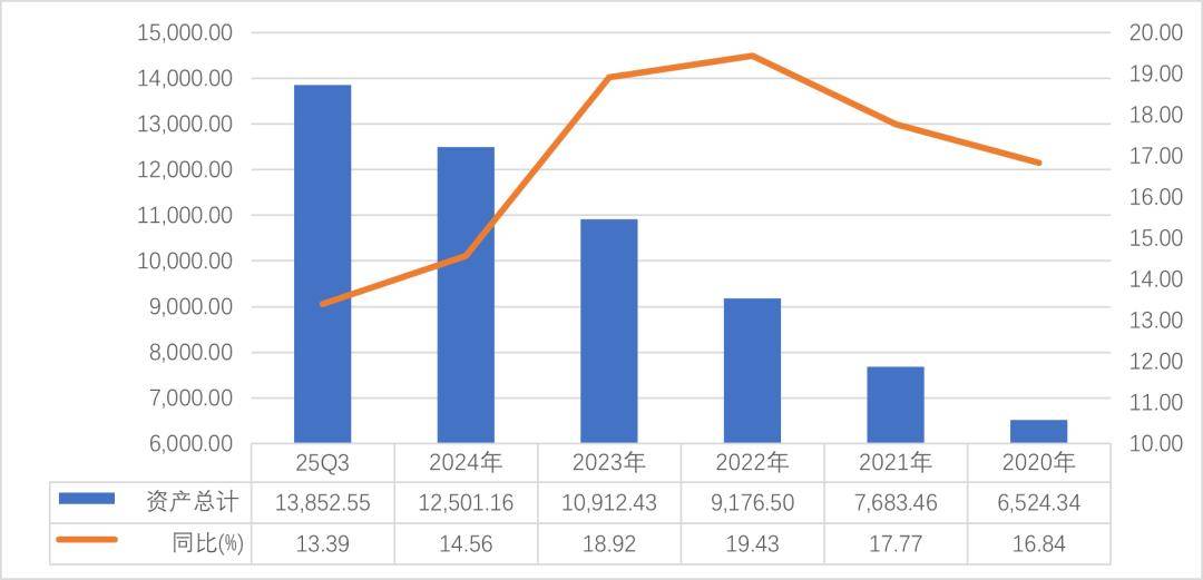成都银行三季报显示,其总资产13852.55亿元,同比增长13.39%。扩表自2024年放缓,2025年进一步下降,但较银行业前三季度总资产同比增长7.9%,高出4.39个百分点。