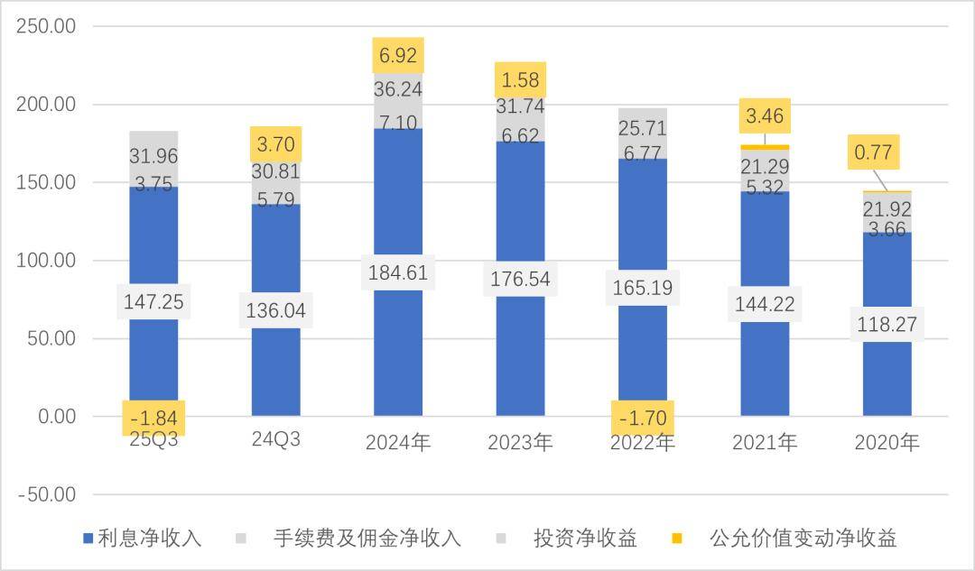 成都银行25年前三季度投资收益+公允价值变动合计30.12亿元,去年同期为34.51亿元,相比去年略有逊色。