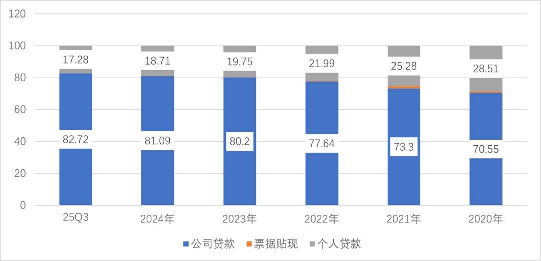 然而,其贷款结构严重偏向低定价领域:对公贷款高度集中于“租赁和商务服务业”、“水利、环境和公共设施管理业”(通常与政府及基建项目相关),2025年上半年合计占比已达64%;个人贷款中利率下行较快的住房按揭贷款占比仍超70%。