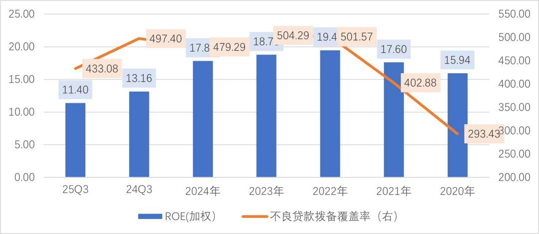 虽然扩表放缓,但得益于控费,成都银行净利润仍处于增长区间。25年前三季度ROE为11.4%,大幅优于上市银行7.26%中位数水平。不良贷款拨备覆盖率虽有所下降,但仍高于400%,未来仍有释放利润的空间。
