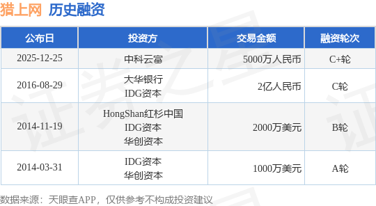 证券之星消息,根据天眼查APP于12月25日公布的信息整理,猎上网络科技(上海)有限公司C+轮融资,融资额5000万人民币,参与投资的机构包括中科云富。