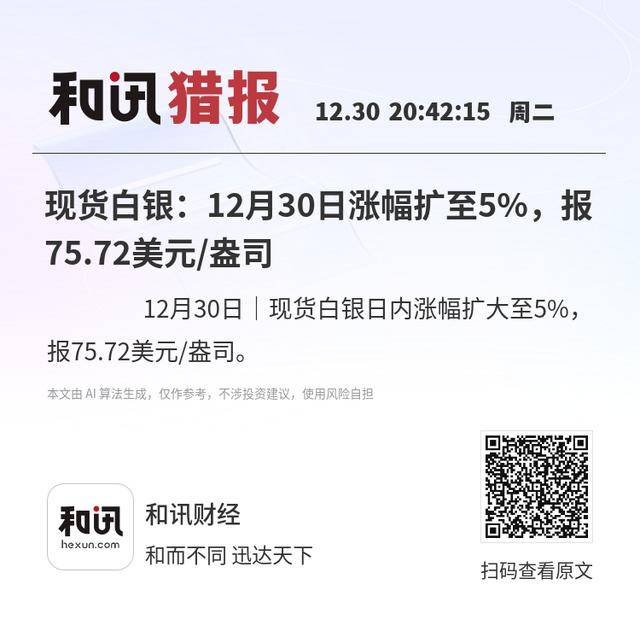 12月30日|现货白银日内涨幅扩大至5%,报75.72美元/盎司。