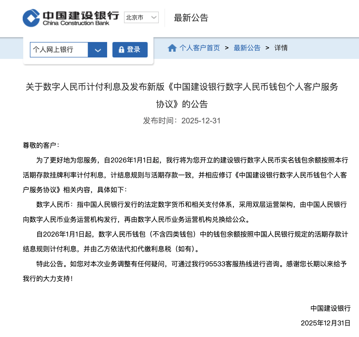 建设银行12月31日发布关于数字人民币计付利息及发布新版《中国建设银行数字人民币钱包个人客户服务协议》的公告显示,自2026年1月1日起,建设银行将为客户开立的建设银行数字人民币实名钱包余额按照该行活期存款挂牌利率计付利息,计结息规则与活期存款一致,并相应修订《中国建设银行数字人民币钱包个人客户服务协议》相关内容。