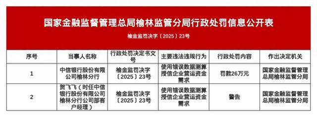 针对以上问题,国家金融监督管理总局榆林监管分局对其罚款26万元;对时任中信银行股份有限公司榆林分行公司部客户经理的贺飞飞警告。