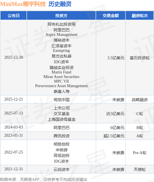 证券之星消息,根据天眼查APP于12月30日公布的信息整理,上海稀宇极智科技有限公司基石投资轮融资,融资额3.5亿美元,参与投资的机构包括阿布扎比投资局,阿里巴巴,Aspex Management,博裕资本,汇添富资本,Eastspring,易方达私募,IDG资本,建峖实业投资,Martis Fund,Mirae Asset Securities,MPC VII,Perseverance Asset Management,泰康人寿。