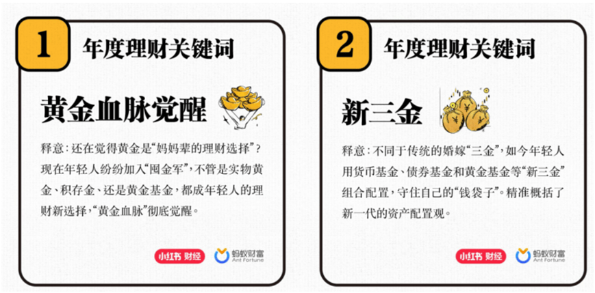 近日,蚂蚁财富与小红书联合发起年度理财关键词投票,2万多名网友票选出了五大关键词:黄金血脉觉醒、新三金、存款搬家、A股回暖和AI叙事理财。