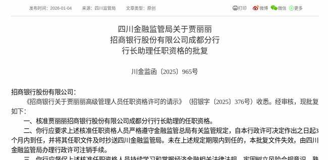 2026年1月4日,根据国家金融监督管理总局消息,《招商银行关于贾丽丽高级管理人员任职资格许可的请示》获得通过,批复贾丽丽招商银行股份有限公司成都分行行长助理的任职资格。