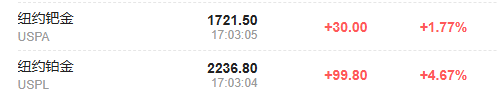 除了黄金、白银,铂金和钯金等贵金属也全线上扬。