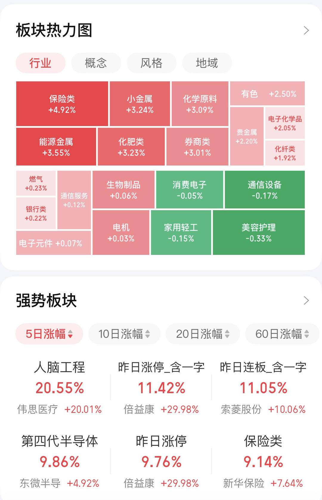 涨幅靠前的热门行业包括大金融、有色金属、医疗、化纤、脑机接口等。主力净买入靠前的板块有券商、小金属、有色金属等。