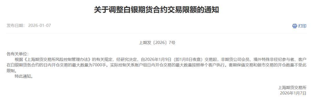 同日,上期所发布关于调整白银期货合约交易限额的通知。根据《上海期货交易所风险控制管理办法》的有关规定,经研究决定,自2026年1月9日(即1月8日夜盘)交易起,非期货公司会员、境外特殊非经纪参与者、客户在白银期货各合约的日内开仓交易的最大数量为7000手。实际控制关系账户组日内开仓交易的最大数量按照单个客户执行。套期保值交易和做市交易的开仓数量不受此限制。