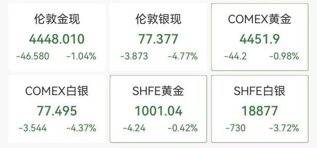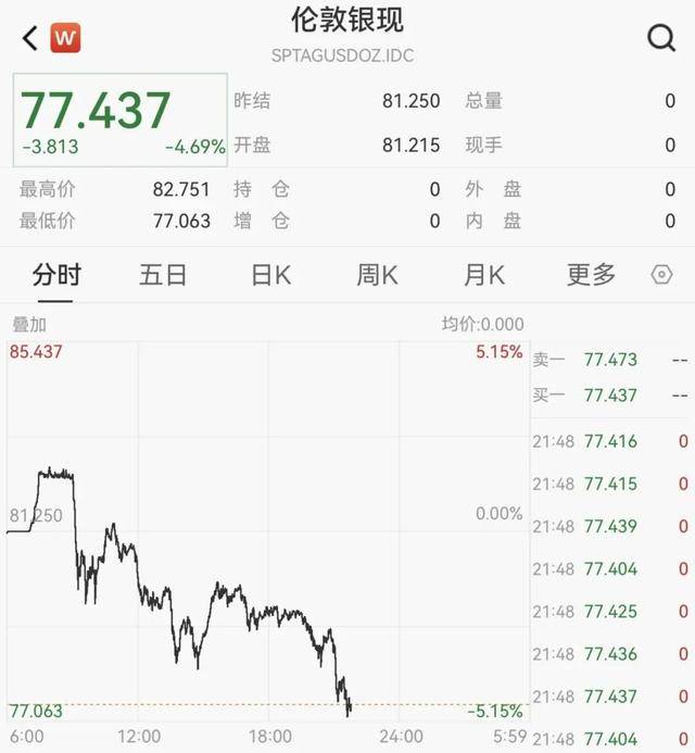 现货白银在突破80美元/盎司后,今日短线走低,现报77.44美元/盎司,日内跌4.69%。